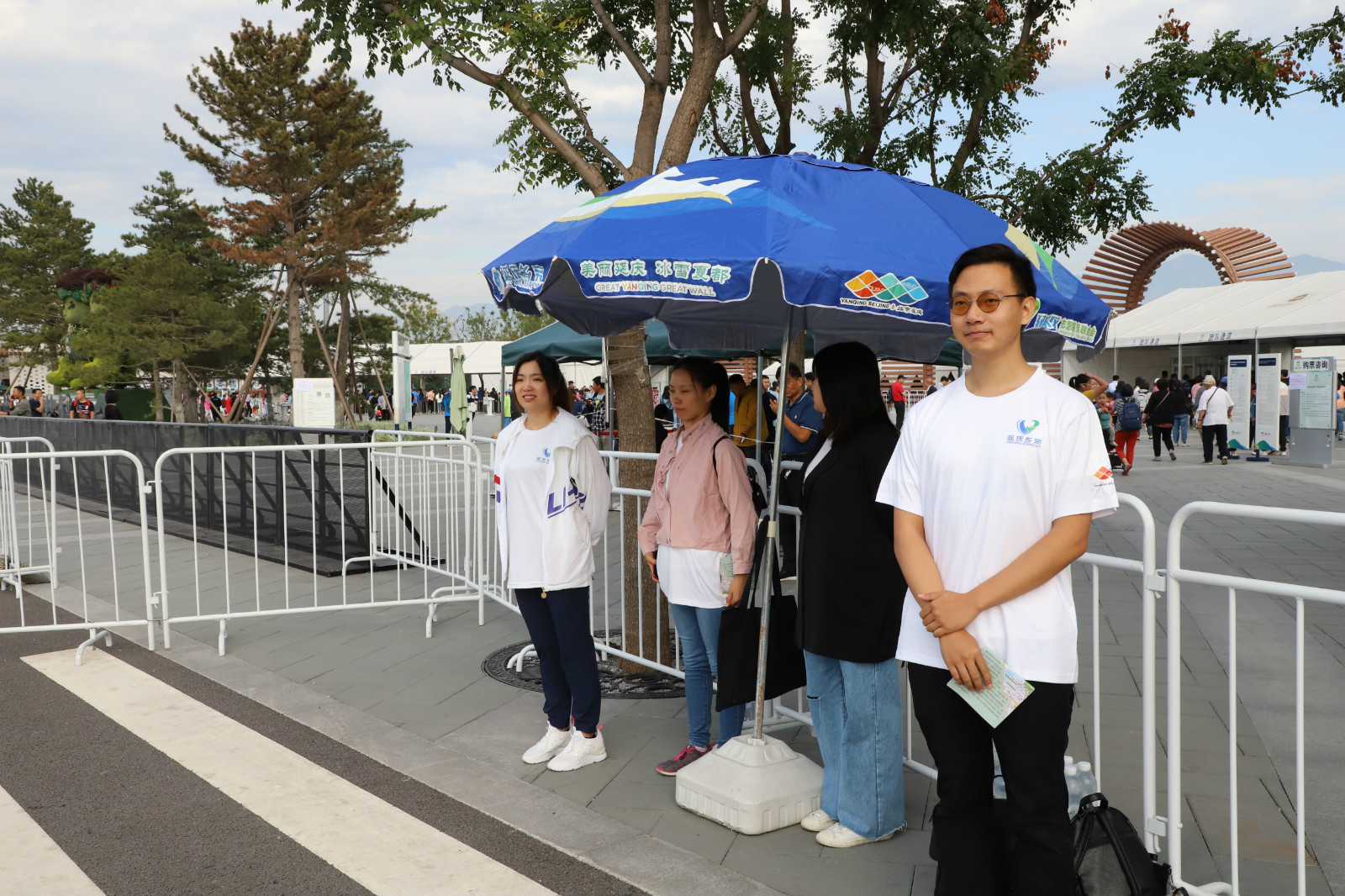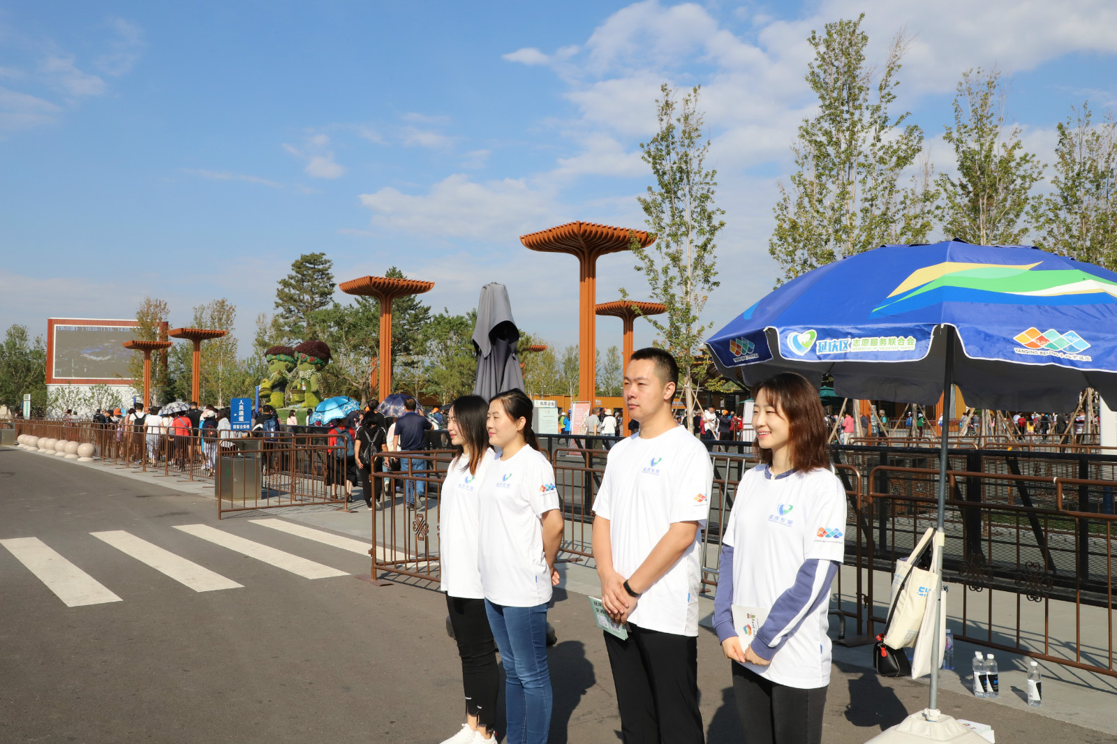 迎着晨光出发,踏着晚霞返程。志愿者们在3大区域10余个岗位悉心服务,承担站点服务、游客引导等相关工作。在强日晒环境下,每位志愿者平均服务时间近5个小时。