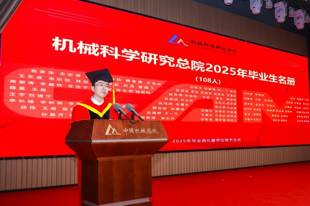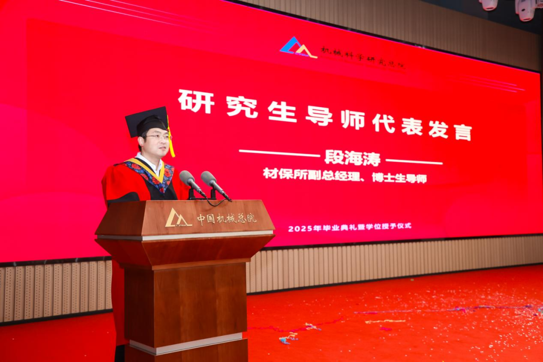 材保所副总经理、博士生导师段海涛作为导师代表发言,为全体毕业生送上嘱托和期望。他希望同学们树立“大志向”、坚守“大担当”、秉持“大情怀”,用真才实学镌刻属于自己的璀璨印记。