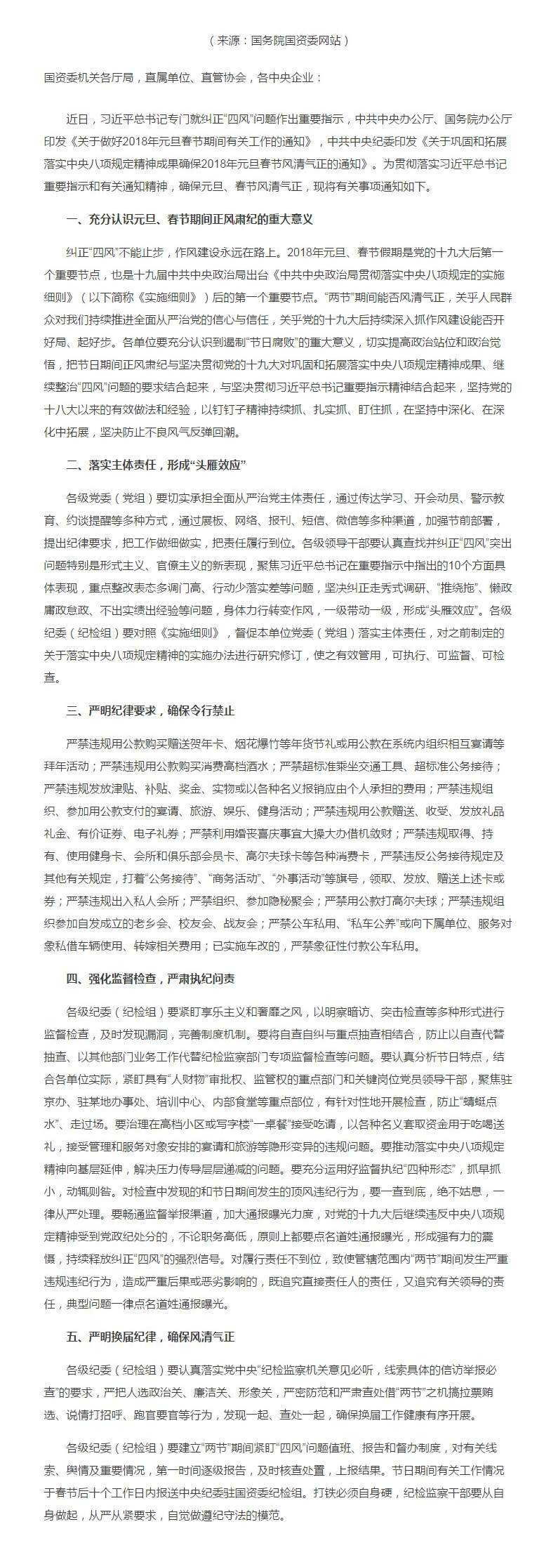 中央纪委驻国资委纪检组关于2018年元旦、春节期间巩固和拓展落实中央八项规定精神成果的通知